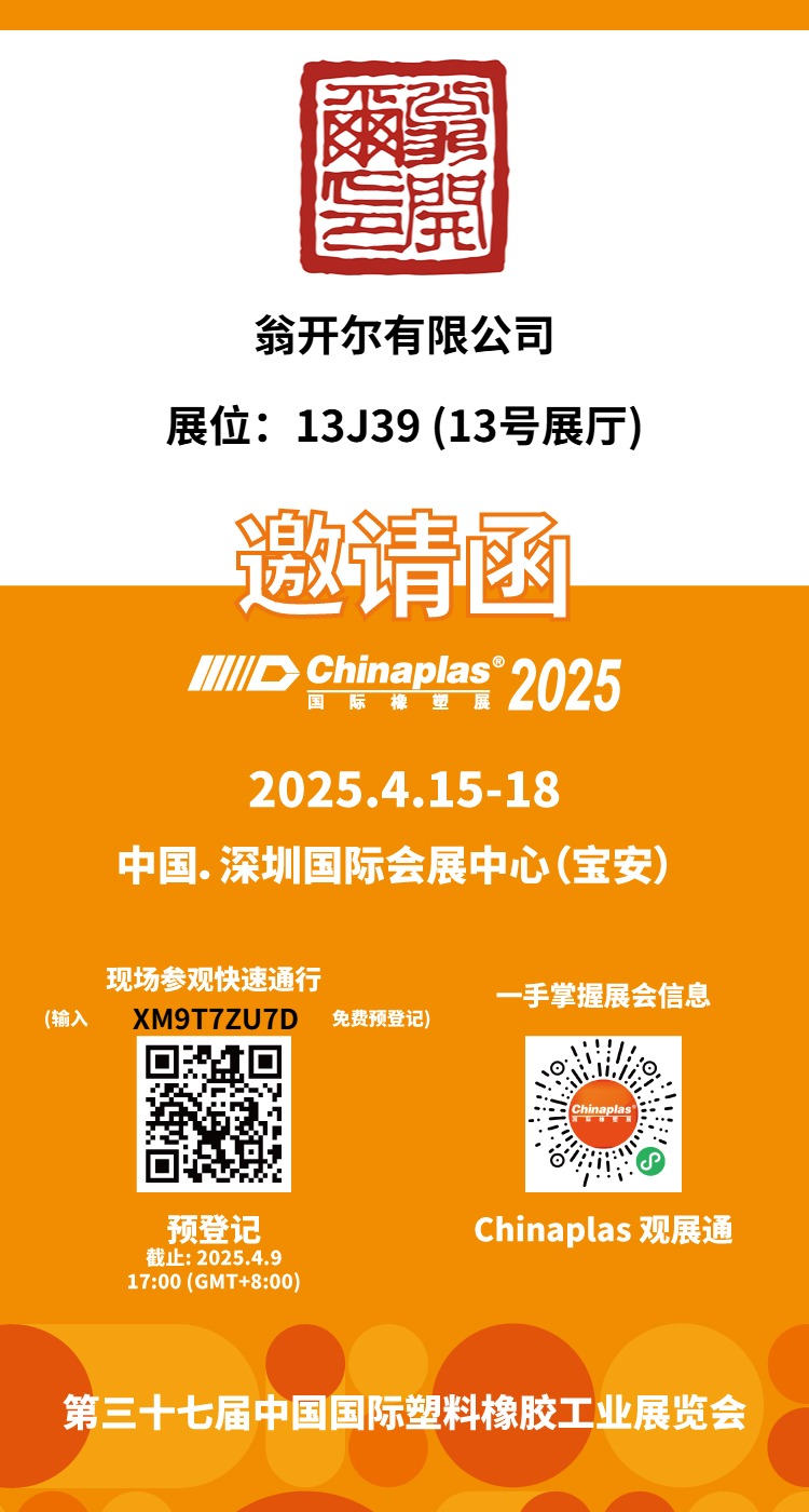 翁开尔诚邀您莅临参观 chinaplas 国际橡塑展