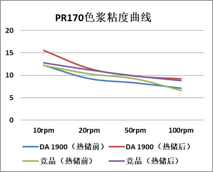 从以上结果可以看出,da 1900对rp170红颜料有优异的分散效果和储存稳定性,并提供良好的色彩鲜艳度,饱和度。钛白冲淡着色力强。